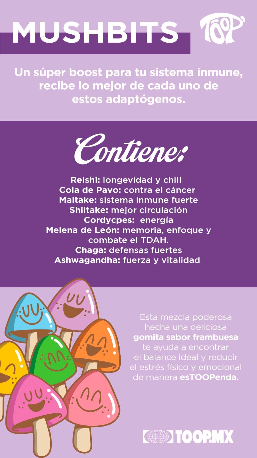 Reishi es usado para mejorar la memoria y por sus propiedades anti-envejecimiento. Beneficia el sistema inmune y lleva propiedades antiinflamatorias. Ayuda a reducirr el estrés, calma la mente y relaja el cuerpo.