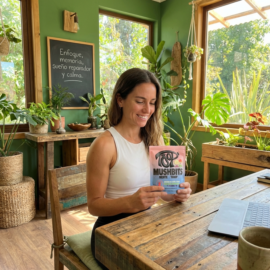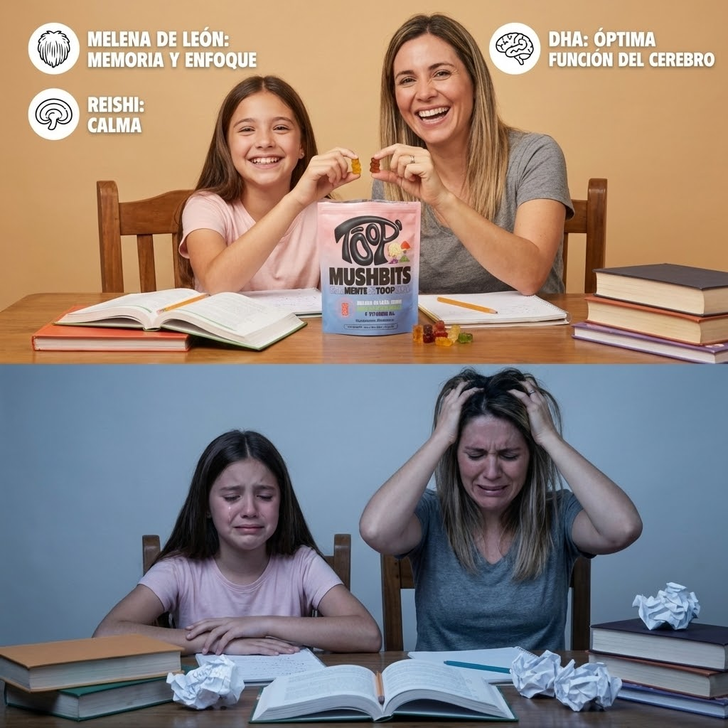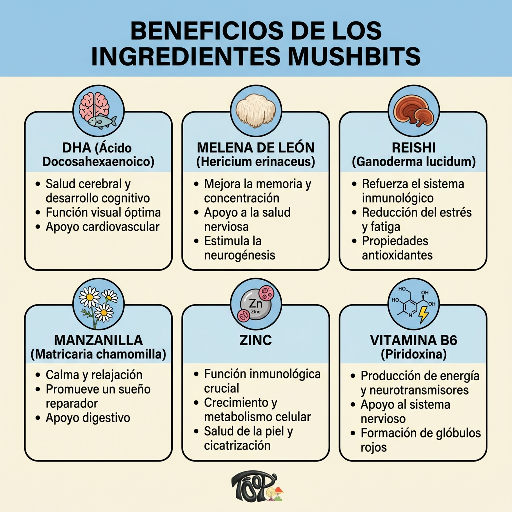 Las MUSHBITS focus contienen: DHA, melena de león, reishi, zinc, vitamina B6 y manzanilla.